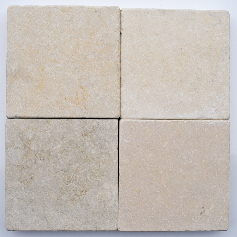 Deze getrommelde marmer is in hoofdzaak van een beige tint met roze, gelige en grijze nuances/aders.